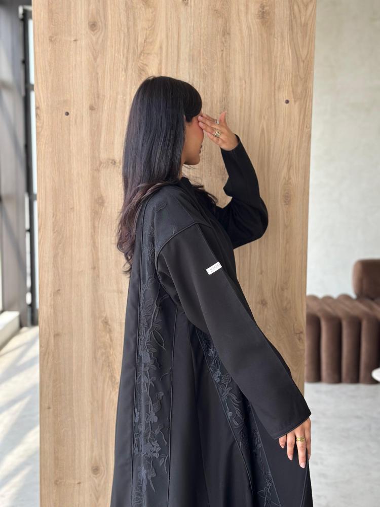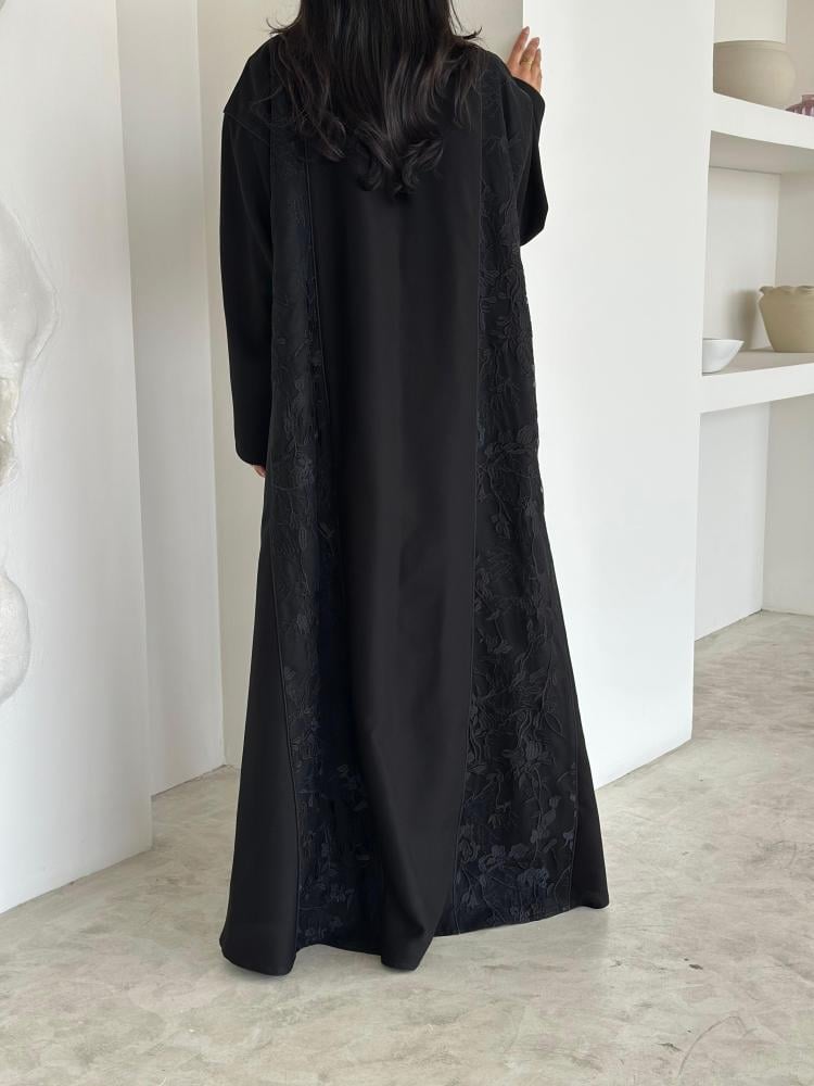 عباية من خام الكريب مع تدخيلة من قماش التل المطرز